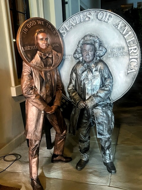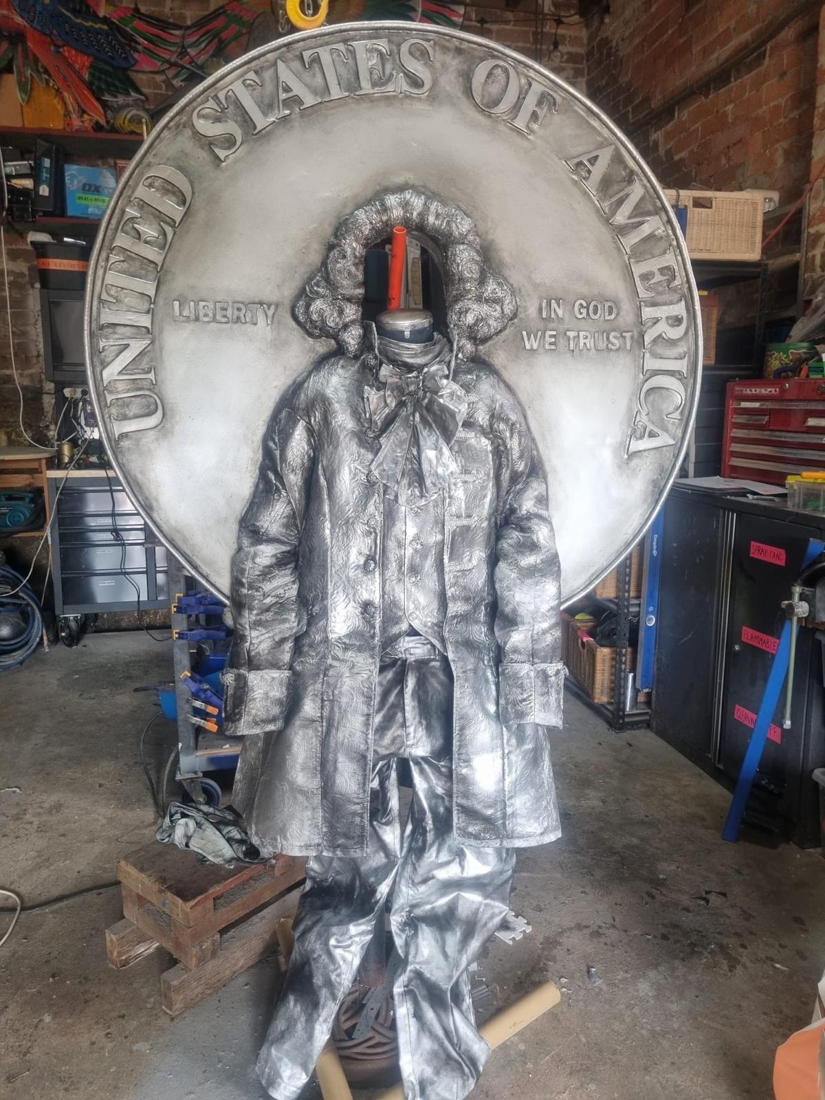 George and the team were given 10 days to create two life sized coin costumes for a high profile television commercial. The coins were paired with metallic costumes custom fitted to the actors.